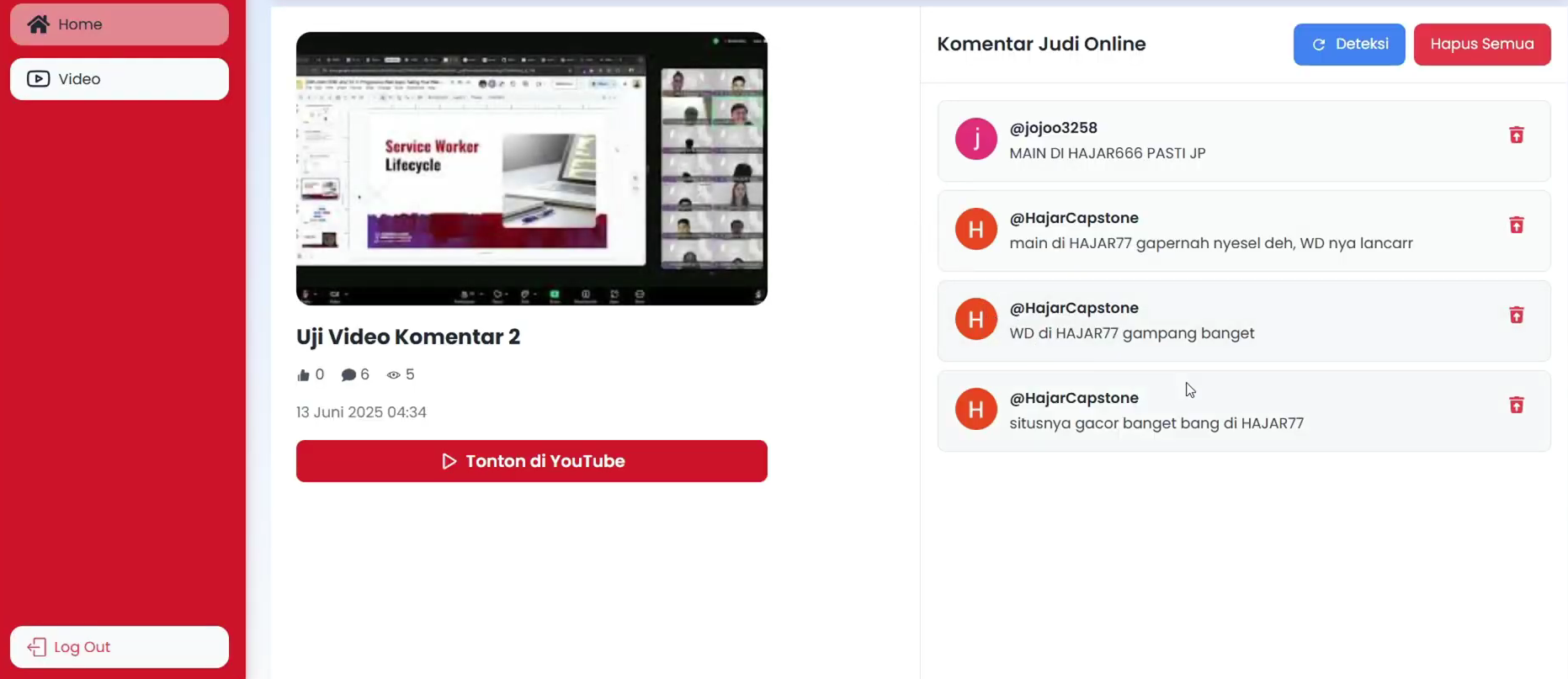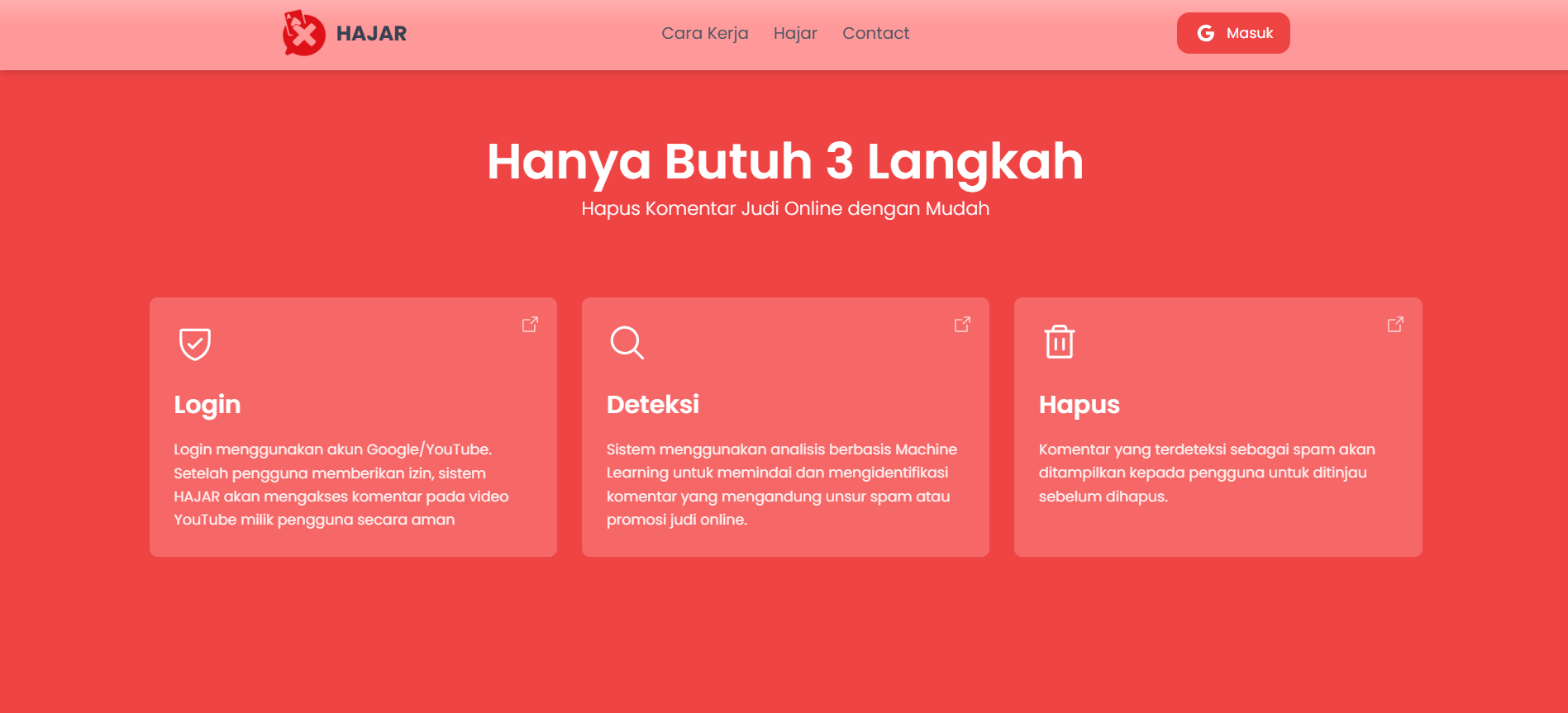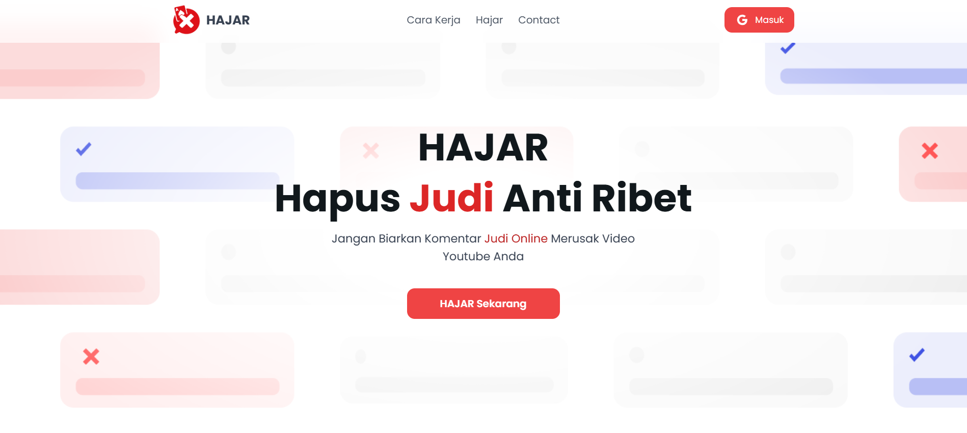 HAJAR is an intelligent platform that detects and filters gambling-related spam comments on YouTube automatically. Built with Next.js and Hapi.js, it leverages IndoBERT (Indonesian Bidirectional Encoder Representations from Transformers) to accurately identify gambling content, even when disguised with symbols or hidden words. Integrated with YouTube API, HAJAR enables content creators to analyze and remove spam comments efficiently, creating a safer digital environment and protecting vulnerable users from illegal gambling promotions.